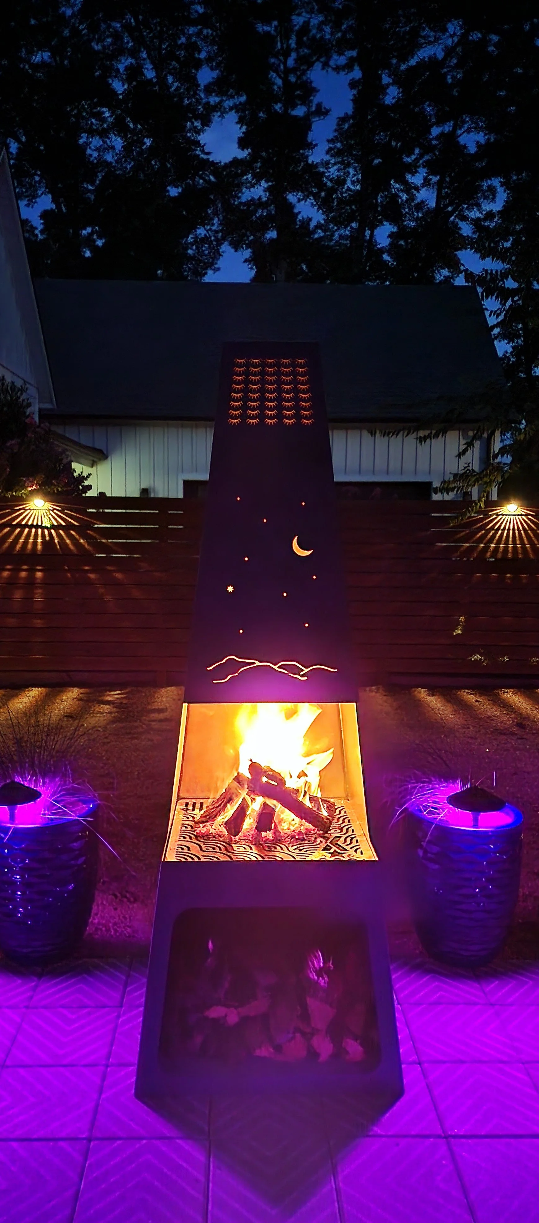 7 foot tall 12 gauge all metal welded design with customizable cutouts, 1/4 inch laser cut grate & slide out rear ash tray & wood storage area - raw metal, clear coat or high heat paint finish